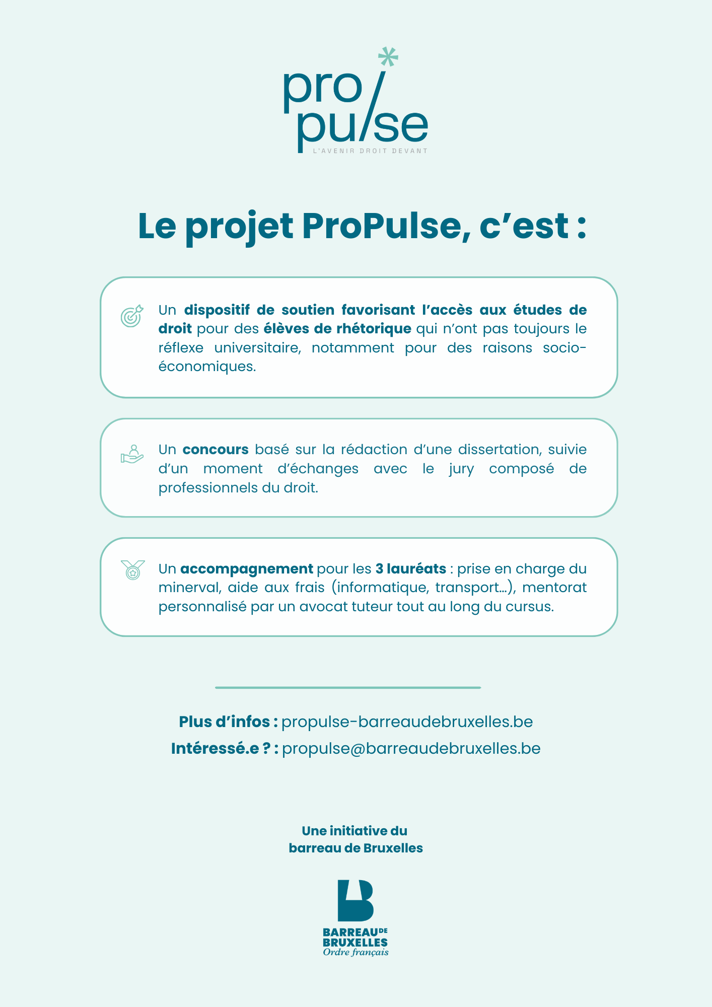 Pour plus d'informations, veuillez envoyer un e-mail à l'adresse propulse@barreaudebruxelles.be.