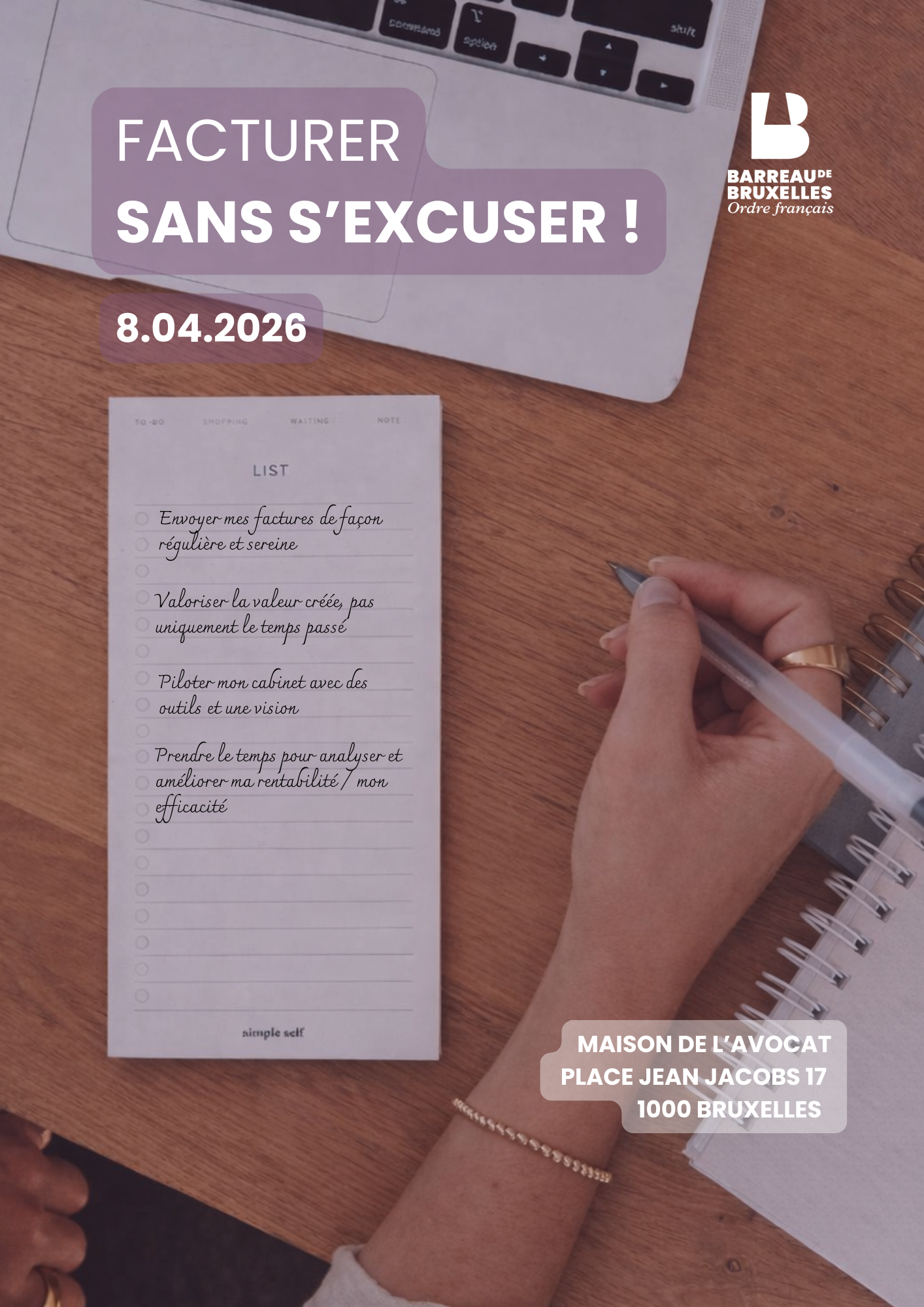 Inscription : https://lgo.avocats.be/event/facturer-sans-sexcuser-2026-04-08-28845/register